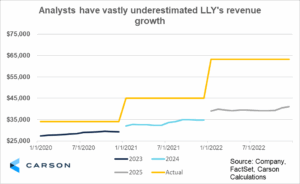 Lilly’s blockbuster-rich pipeline and grand slam in AOMs have powered the company to vastly exceed Wall Street’s long-term estimates of revenue growth. Let’s look at Lilly’s realized revenue compared to analysts’ expectations three years in advance. As shown below, on December 31, 2020, analysts expected Lilly’s full year 2023 revenue (three fiscal years ahead) to be $29.3 billion. The company achieved $34.1 billion in sales in 2023, or 17% higher than analysts expected.