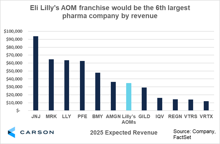 The most nascent of Lilly’s blockbusters are Zepbound & Mounjaro, collectively known as ‘anti-obesity medicine’ (AOMs). These medicines deliver glucagon-like peptides (‘GLPs’) to patients with the intent to achieve weight loss and a reduction in A1C. If Lilly’s history of producing blockbusters was like consistently hitting home runs, these medicines have been two grand slams. Combined revenue for these AOMs is expected to total $34.3 billion in 2025 (according to FactSet estimates as of 11/21/2025). As shown below, this franchise alone would be the sixth largest company by revenue in the pharma and biotech universe.
