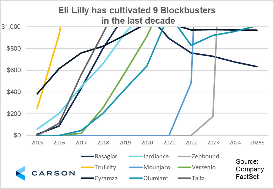 Developing nine blockbusters is quite a unique feat. Within the pharmaceutical and biotech universe (comprised of 283 publicly traded companies currently in IHE and IBB), 231 see under $1 billion in expected total sales in 2025 (FactSet data). Said differently, any one of Lilly’s nine blockbuster drugs in the past decade would place the company in the top 20% of pharma and biotech companies by sales alone. But there’s a bigger reason why Lilly stands at #1 in healthcare.