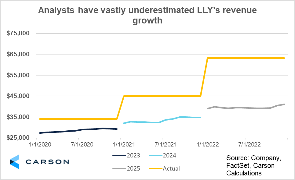 The company’s outperformance has only grown in recent years. At year end 2021, analysts expected Lilly’s 2024 sales to be $34.8 billion. The company achieved revenues of $45.0 billion in 2024, a 29% beat. Lilly’s 2025 revenue, based on the company’s most recent guidance, is forecasted to be around $63.3 billion, whereas three years ago analysts expected $41.1 billion in 2025 revenue. If Lilly achieves their guidance, it will represent a whopping 54% revenue outperformance compared to analysts’ forecasts (all FactSet data, as of 11/21/2025).