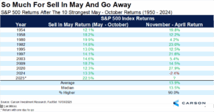 Here’s a nice table that shows that indeed May through October is the worst six months for the S&P 500 historically. But that means the next six months are the best, up 7.0% on average and higher 76% of the time.