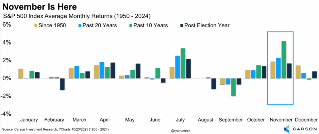 Now we look at the calendar and we see November just ahead, which historically is a very strong month and kicks off a run of some of the strongest months of the year. Yes, we’ve seen a huge rally into this usually bullish period, but does that mean the bull will tire? Maybe not, as we discuss below.