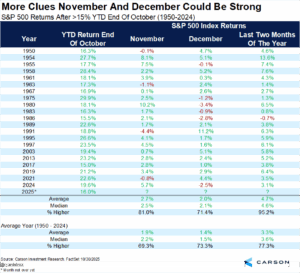 Adding to the fun, when the S&P 500 is up more than 15% for the year heading into the usually bullish month of November, the eleventh month of the year does even better than average at 2.7% versus 1.9% (and so does December).