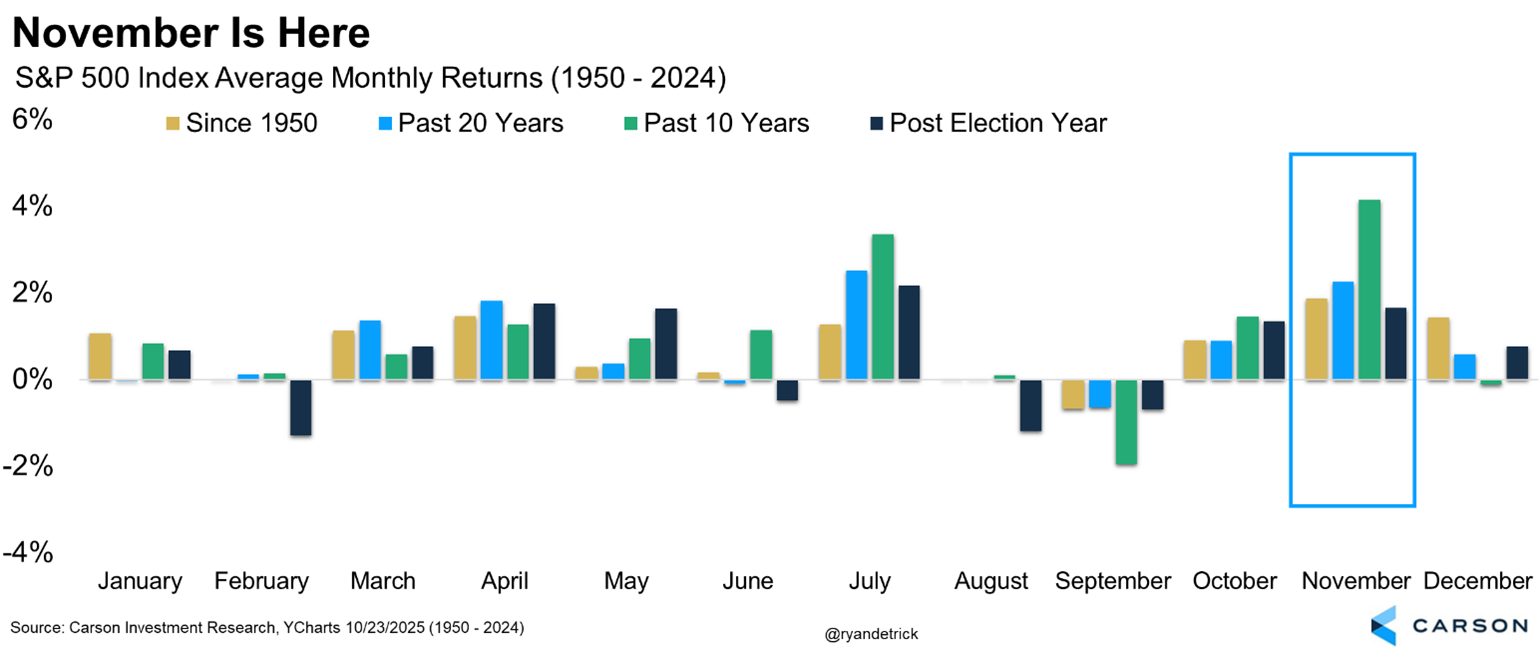 November is the best month on average since 1950, the second best the past 20 years, the best the past decade, and the third best in a post-election year.