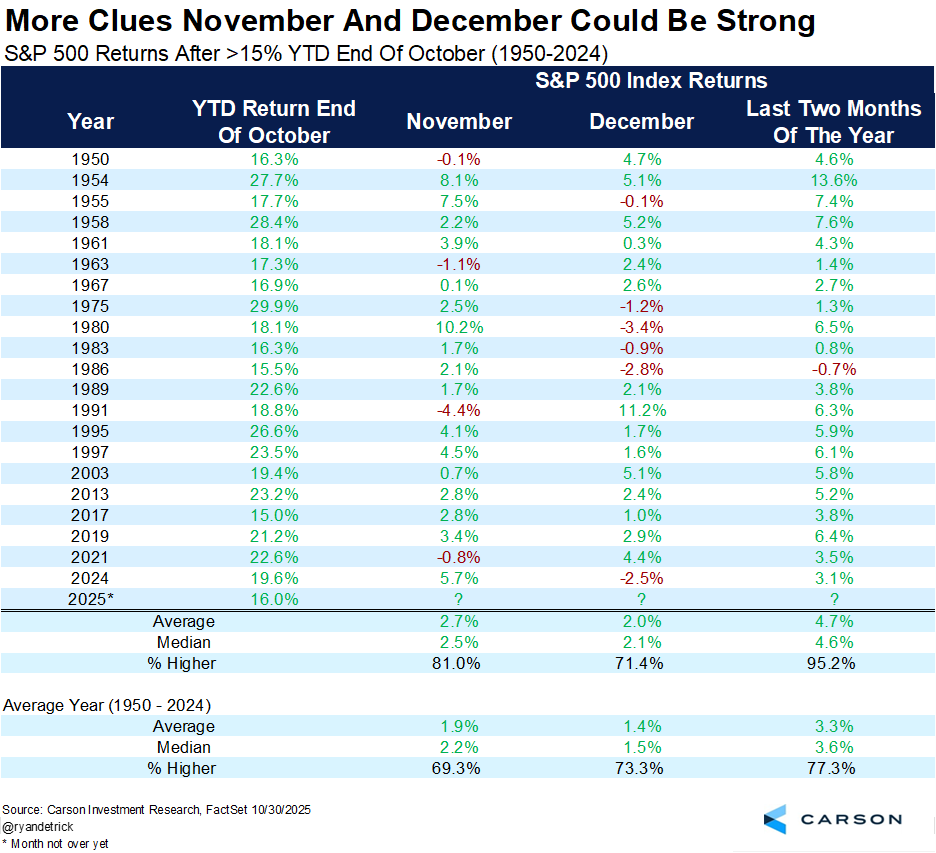 Adding to the fun, when the S&P 500 is up more than 15% for the year heading into the usually bullish month of November, the eleventh month of the year does even better than average at 2.7% versus 1.9% (and so does December).