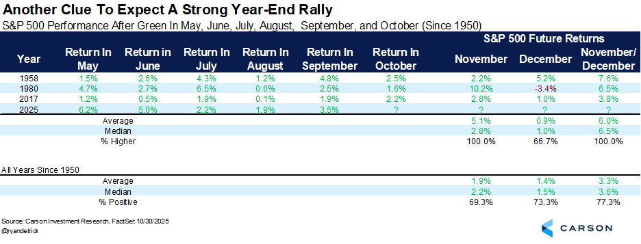 Remember when the media meme machine told you to “Sell in May and go away”? Well, it does have data to back it (even if “go away” isn’t the right answer, as I discussed at the time in Why We Think You Shouldn’t Sell in May). Historically the six months from May through October are the weakest six consecutive months of the year (chart on that below), but that sure wasn’t true this time! In fact, the S&P 500 gained all six months for only the fourth time ever, joining 1958, 1980, and 2017 in the record books. But even more incredible, the S&P 500 is up more than 22% during these historically weak months, the best “Sell in May” return ever!