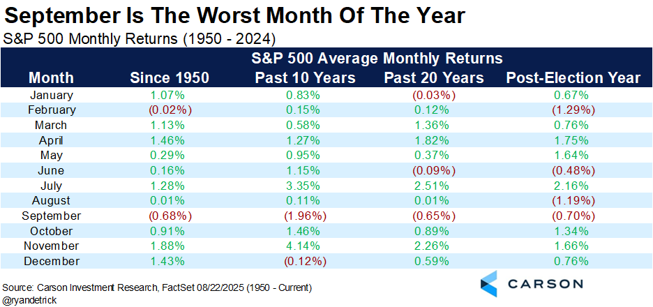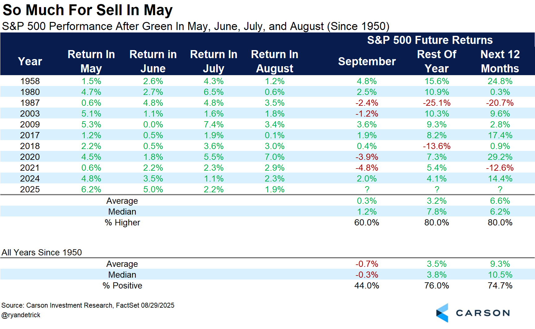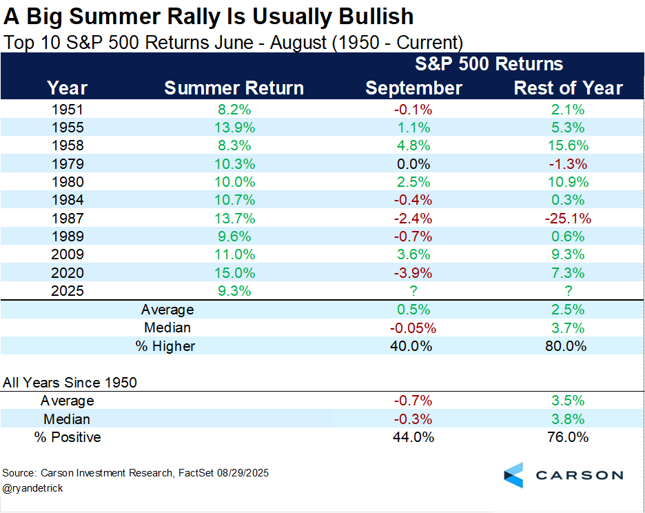 Well, instead we just had one of the best summer rallies (measured by the returns in June, July, and August) in history, with the S&P 500 up 9.3%, which came in as the best summer rally since 2020 and 2009 before that. Here are the top 10 best summer rallies ever and what happened next. All in all, September tends to be weak, while the rest of the year was higher eight out of 10 times.