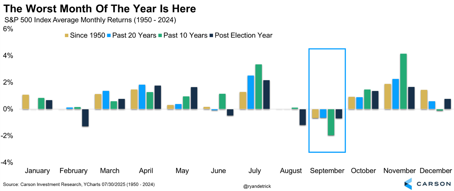 Here’s a nice way to show how weak this month has been historically. It is the worst month since 1950, over the past 10 years, over the past 20 years, and the third worst in a post-election year. We would never invest blindly solely based on calendar effects, but it is better to know about them than not. Of course, we noted a month ago that stocks usually do poorly in August (especially in a post-election year) and the market bucked the trend this year. That’s not completely unexpected—surprises to the upside are just more likely to happen in bull markets. The catalyst this time was Federal Reserve (Fed) Chair Jerome Powell’s dovish pivot in his speech at Jackson Hole on Friday, August 22.