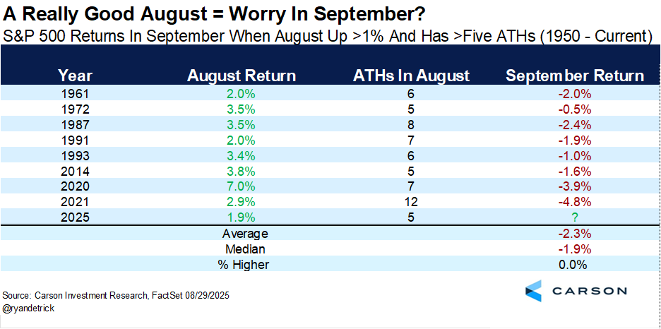 Turns out when the S&P 500 gains at least 1% in August and has at least five all-time highs, the month of September has never been higher (lower eight times out of eight).
