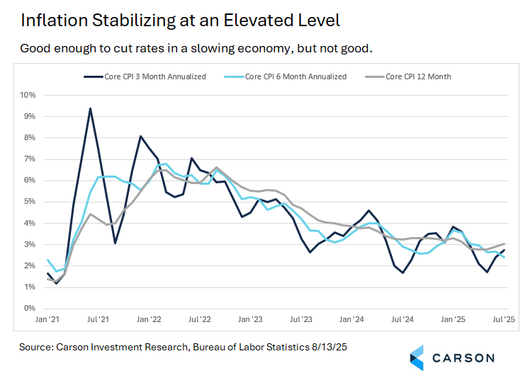 The market cheered the July Consumer Price Index (“CPI”) inflation report released yesterday, August 13, 2025, but mostly because it was perceived to be good enough to keep the Federal Reserve (“Fed”) on track for a September rate cut. The market-implied odds for a September cut rose from 86% to 94% according to the CME Groups FedWatch tool. There is some important data yet to come before the next Fed meeting on September 16–17, but the Fed generally does not like to surprise markets and it’s rare for the Fed not to cut when the market-implied odds are greater than 90% heading into the meeting.