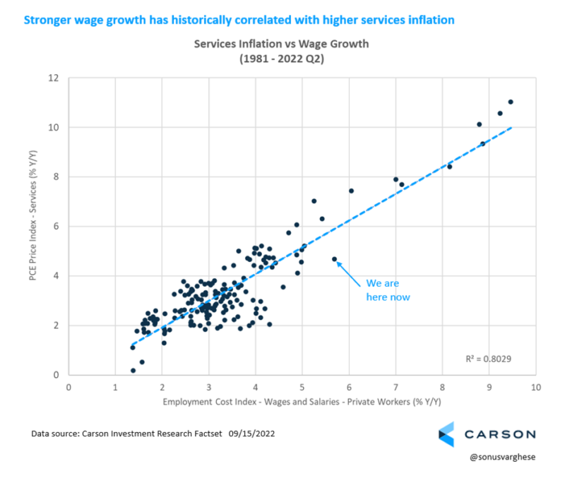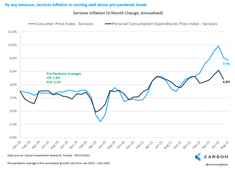 The August CPI report was a disappointing one, especially core inflation which strips out food and energy. As my colleague Ryan Detrick wrote, a lot of services costs, such as dental services, all came out hotter than expected. While there may be some noise in the month-to-month numbers, services inflation is running at a 7.7% annualized pace over the past three months (June-August). This is well above the pre-pandemic average pace of 2.8%. Even if you look at the Federal Reserve’s preferred inflation gauge, the personal consumption expenditure index, services inflation over the three months leading into July was running at a 4.8% annualized pace (we’ll get August data in two weeks) – it averaged 2.3% before the pandemic.