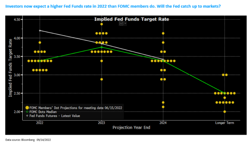 As you can see, the green line for 2022 is well below the white line (investor expectations). The Fed has a meeting coming up next week and perhaps the most important thing we will be watching is how much higher they move their own estimates, and whether they get as far up as where the market is right now.