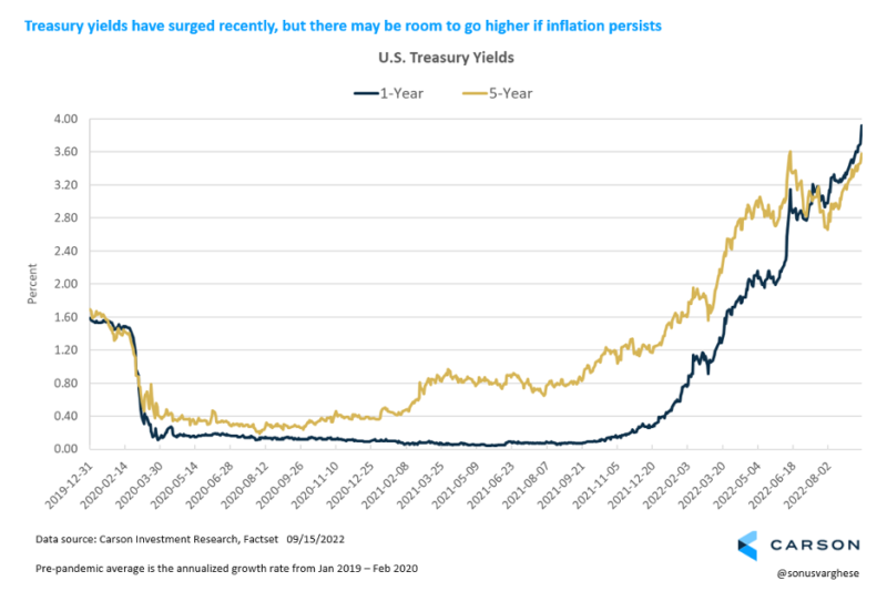 Short-term treasury interest rates, which are a good approximation of monetary policy, have surged this year, and are well above pre-crisis levels. After the August inflation report was released, 1-year rates rose from 3.70% to 3.92%, while slightly longer-term 5-year rates rose from 3.47% to 3.58%. So, they certainly are closer to where policy rates may get to, but not quite there yet.