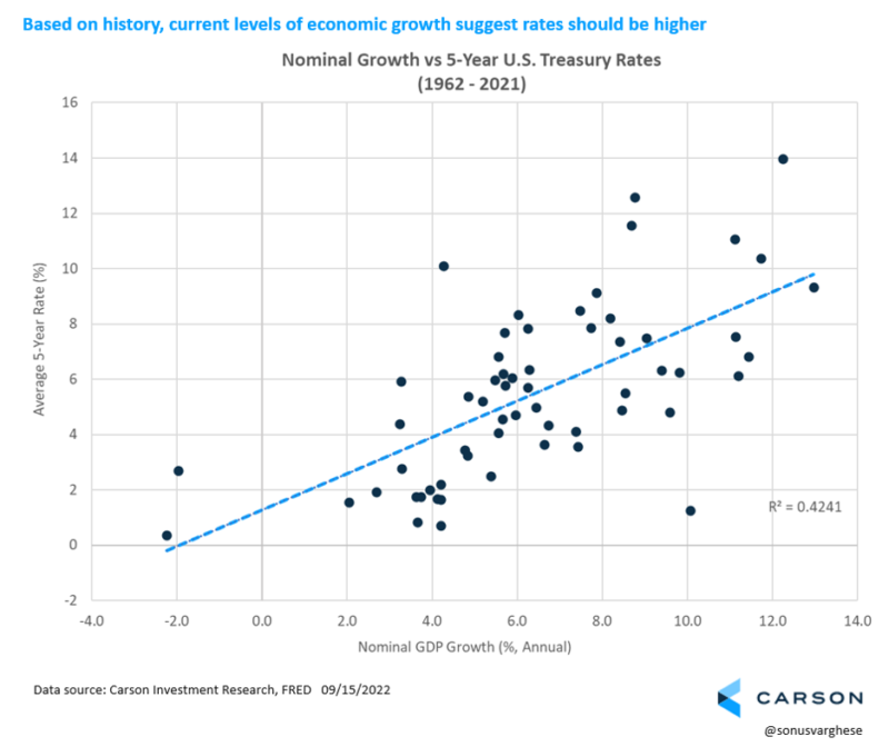 The pre-crisis average for nominal GDP was around 4% and 1-year rates averaged under 1.0% while 5-year rates averaged about 1.7%. We are clearly in a different environment now, and based on history, yields should be higher than what they are now.