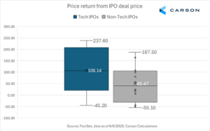 The chart also shows a more favorable distribution of outcomes for tech IPOs. Technology’s best performing IPO, CoreWeave, has returned 237% compared to its deal price, whereas Amer Sports’ 188% return since its deal is the best performer in the non-tech cohort (price return data from FactSet as of 6/5/2025 closing prices).