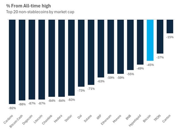 The drawdown in Bitcoin from all-time highs, as mentioned earlier, is substantial and in line with past declines, but this gets even worse across major cryptocurrencies. Many of these names, with large market caps and user bases, are down substantially from their tops.