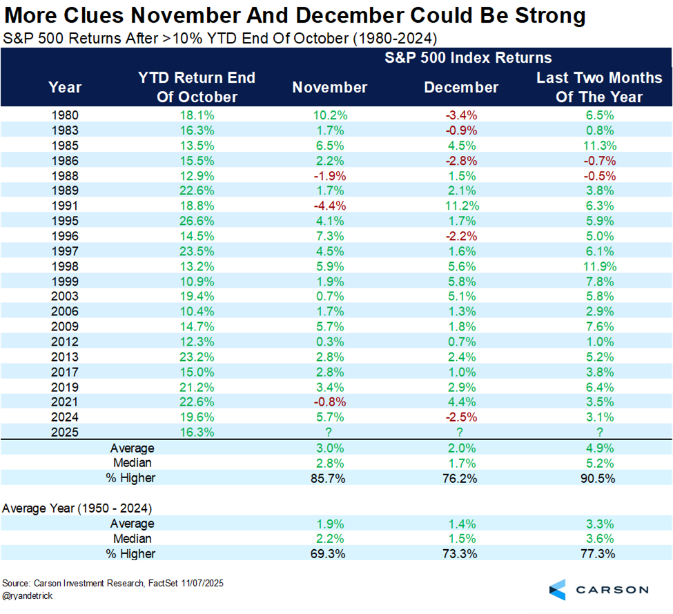 Yes, it has been a rough start to November, but after a six-month win streak for the S&P 500, some consolidation is perfectly normal before another surge higher. And we have found that when the S&P 500 was up more than 10% year-to-date heading into November (like this year was), the month of November has been higher 13 out of the past 14 years and the final two months (November and December) have been higher the past 16 times in a row. Don’t give up on November just yet.