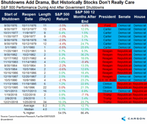 Below is a table we put together that shows how stocks are up a little bit during the previous 22 shutdowns, but a year later have been higher 19 times and up an average of nearly 13% a year later. Yes, each time is different and we would never suggest investing based on what the government does (or doesn’t do). But it is important to remember not to worry too much about your investments based on the dysfunction out of Washington.