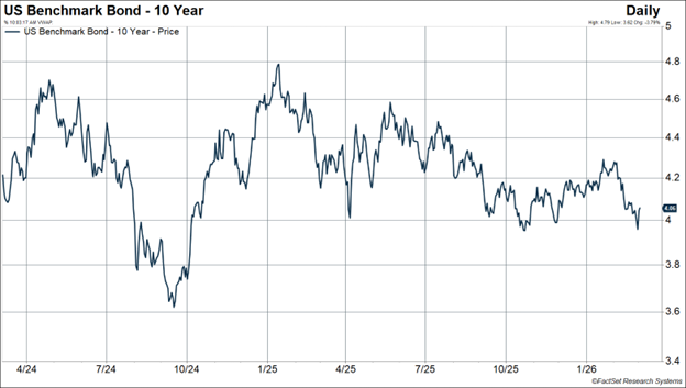 The 10-year Treasury yield finished 2025 at 4.17% and has held a roughly 4-4.25% range since early September, reaching the top of that range in January but declining sharply in February, partly as a risk-off move amid the US force buildup in the Gulf region. While there’s some folly in point estimates, our view is that the 10-year yield ends 2026 closer to the top of that range, especially given what’s happening right now with inflation. If that turns out to be true, a 10-year Treasury would have a total return of about 1.5% over the rest of the year, with a price decline of about 2% cushioned by coupon payments in the mid-3% range. That’s less than you would expect from Treasury bills, but because intermediate Treasuries are a hedge against downside risk in some scenarios, it’s still worth giving them a meaningful weight.