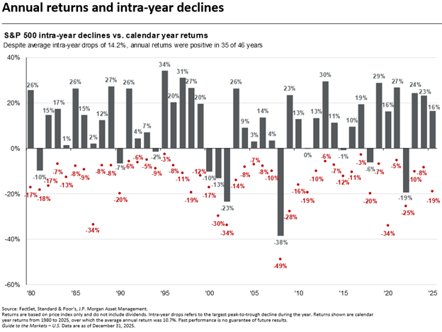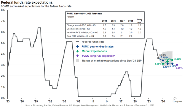 The Fed cut rates by 0.25% three times in 2025 in response to weakening labor-market data. This led to a significant steepening of the curve, with short-term rates coming down almost in lockstep with the Fed, while longer-term rates remained elevated. Longer rates remained stickier as markets continued to have concerns about the impact of tariffs on inflation. The FOMC’s long-run policy rate projection remains at 3.00%, with markets pricing in even higher rates than the FOMC’s projections well into the future (driven by inflationary and policy concerns from 2028 onward). Markets are currently pricing in another 2-3 rate cuts in 2026, although there is a much wider dispersion in potential outcomes. The Fed did shift its focus from inflation to the labor market in the second half of 2025 (which led to the beginning of rate cuts for the year), but that attention could swing back to inflation if readings become hot. Add in a healthy dose of geopolitical risk and the upcoming conclusion of Jerome Powell’s term as Fed chair, and there seem to be plenty of ingredients for volatility rising to the top of the market.