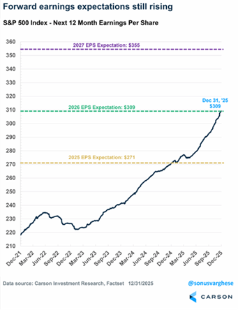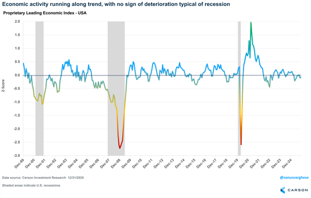 Carson’s proprietary Leading Economic Index (LEI) suggests that economic momentum remains near the long-term trend line (represented by 0 in the chart above), with no strong signs of expansion or contraction. The LEI has rebounded slightly from post-Liberation Day readings, which were below the trend line. The current landscape feels much like mid-2022, when recession fears were elevated but the economy avoided contraction. While the full impact of tariffs remains to be seen in the data, there is optimism that the economy can grow in 2026. Getting less uncertainty about tariffs, continued rate cuts from the Fed, and tax cuts for consumers retroactive to 2025 going into effect all look to be potential tailwinds for the economy.