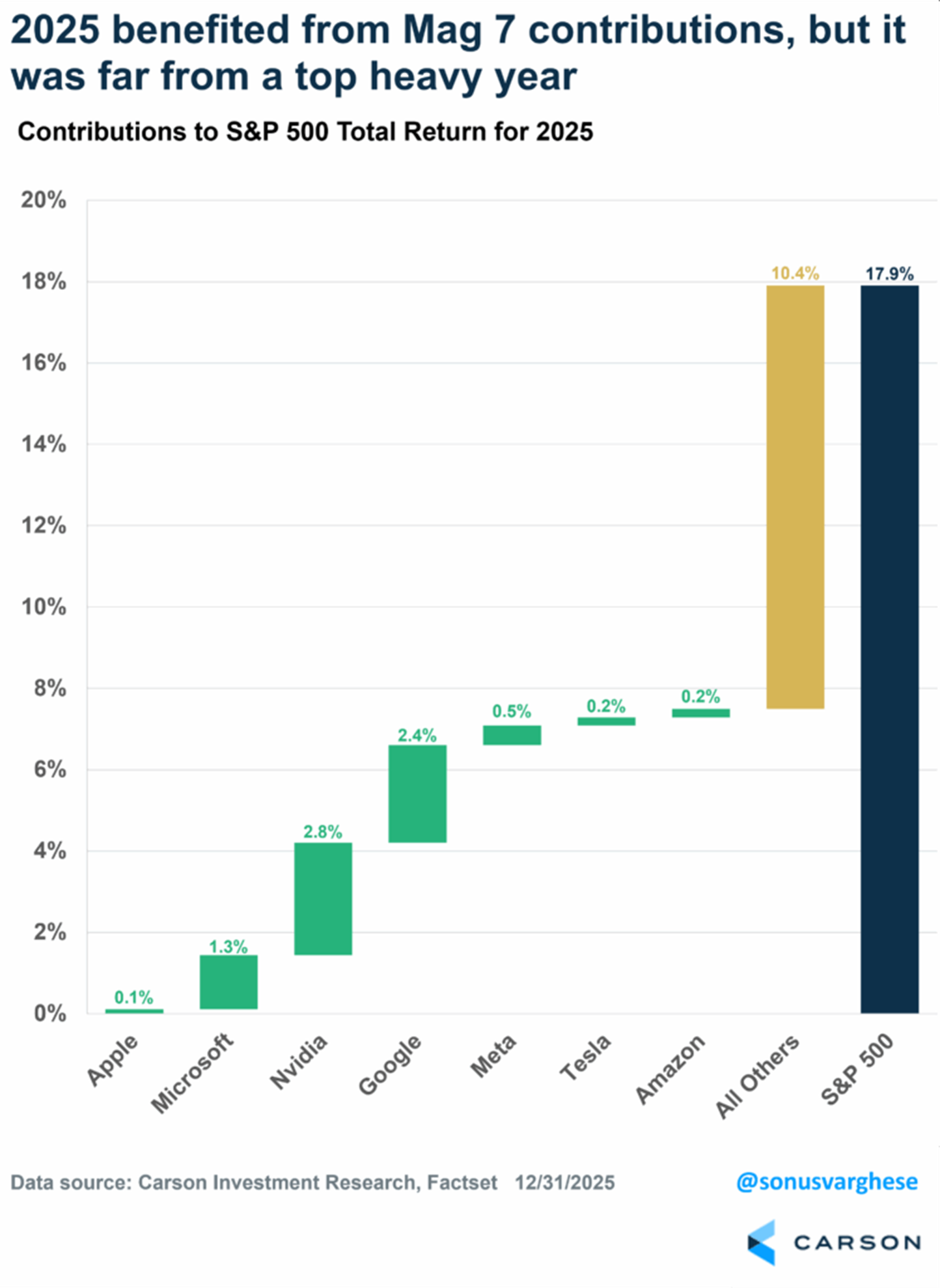 In summary, U.S. stocks delivered strong returns for 2025 yet again on the back of strong corporate earnings. US Large Caps continues to rule the roost, but 2025 saw markets start to broaden away from the predominantly Mag-7 driven markets of 2023 and 2024. The “S&P 493” outperformed the Mag-7 for the year (only 2 individual Mag-7 stocks, NVIDIA and Google, outperformed the S&P 500 on their own), leading to some healthy rotation in market leadership. Small-cap stocks even got in on the party, outperforming mid-caps, as rate cut expectations paint a rosier picture of freed up capital for Main Street.