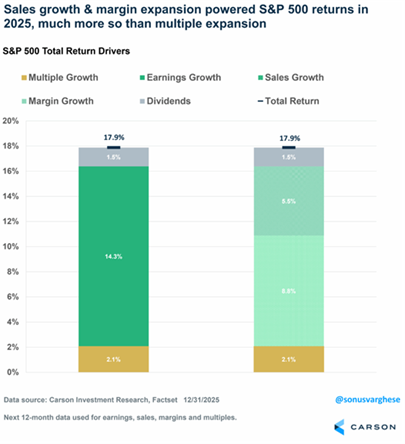 Finally, this was the year of the little engine that could. Beneath the volatility, there has been a consistent engine humming at the core of the economy: corporate earnings. Earnings growth made up the majority of market returns this year, and earnings are projected to continue to grow going forward. There are three main components of stock market returns: