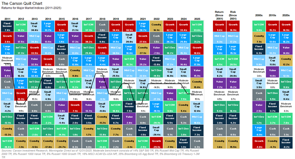 2026 is off and running, with an action-packed January and a further reminder that the oldest trick in the investing book still applies. That “trick” is, of course, diversification, which proved resilient in 2025 as we reminded investors in our 2026 Market Outlook. Now is an ideal time to consider the makeup and risk profile of portfolios. With what appears to be an exciting final day of the month still to go, returns in January bucked a lot of the trends from 2025, with other new trends emerging. Commodities – previously powered by precious metals – have expanded to include industrial metals, oil, natural gas, and now even grains have joined the party. Emerging markets, where many countries are closely tied to the price of commodities, have continued their run from last year as well. We are skeptical of Chinese market returns as part of EM, and we have already seen Chinese stocks turn into a laggard within the very diverse emerging market asset class. Small caps are the other standout so far this year. An asset class that has historically shown a “January Effect” is proving it again this year.
