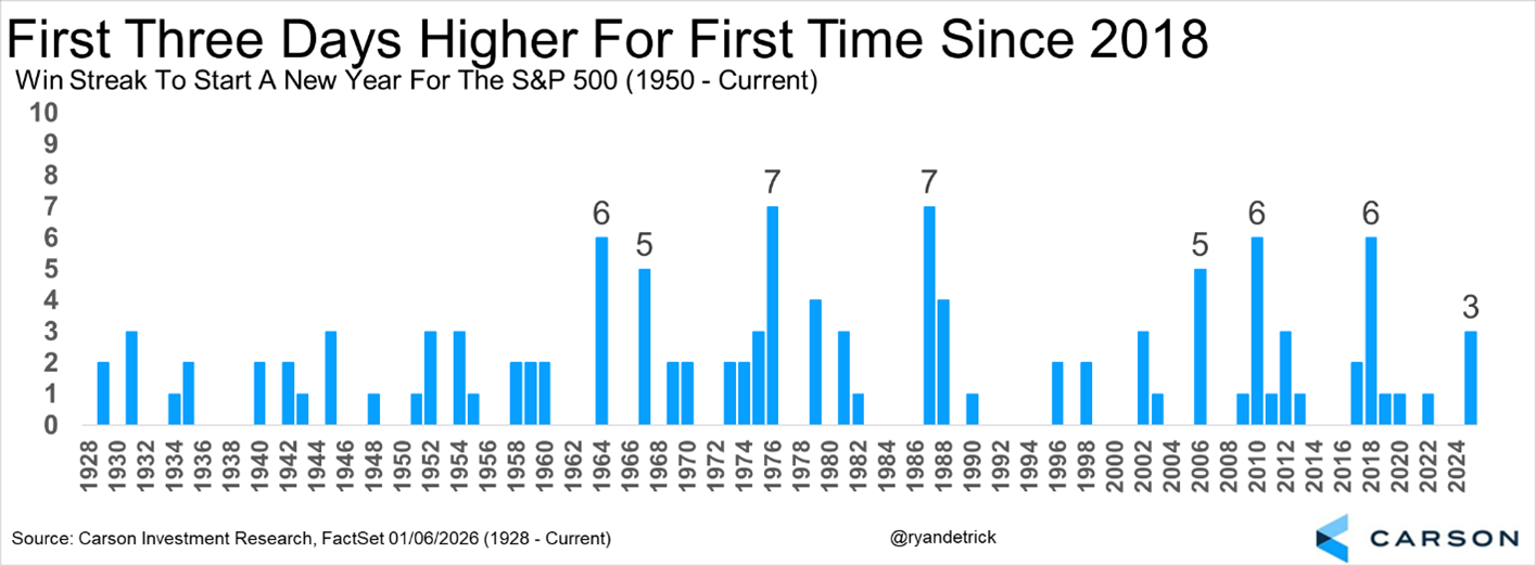 Stocks have picked up right where they left off in 2025, as the S&P 500 is up for the first three days of the year, and it just hit the first new high of 2026. What is interesting is that this is the first time since 2018 that stocks have gained the first three days of the year.