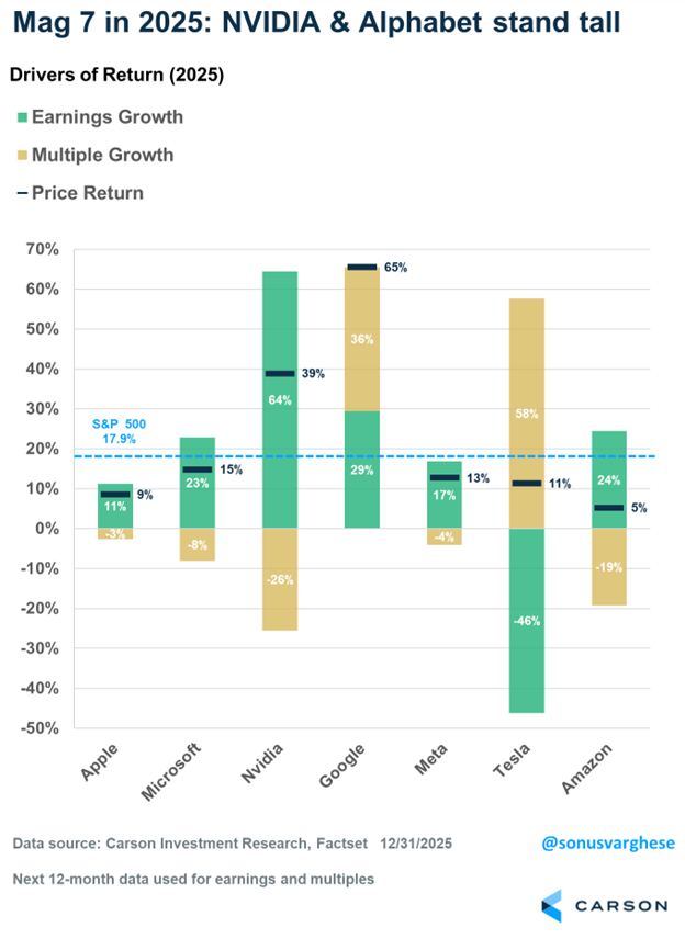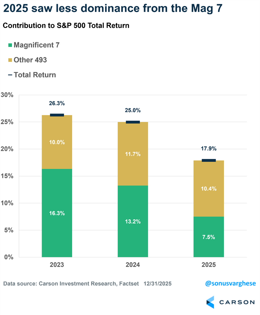 For years, we’ve heard that only seven stocks were going up and accounted for all the market gains, suggesting, again, that this is a bubble. Well, we’ve pushed back against this false narrative for years now, but did you know that last year the other 493 stocks in the S&P 500 accounted for more of the gains last year than the Magnificent 7 did? In the end, it was 10.4% to 7.5%. That’s right, the market gains broadened out, just as we expected.