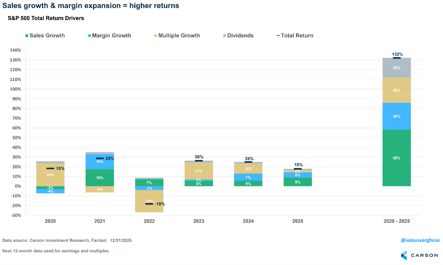 That was last year, what about going back further? We looked back at the past six years, and the S&P 500 gained an incredible 132%. When you peel back the onion, margin expansion accounted for only 26% of the gains. Meaning the rest of the growth came from sales, margin growth, and dividends. Again, if someone tells you stocks have only gone up because of multiple expansion, you can bring this up to poke holes in their thesis.