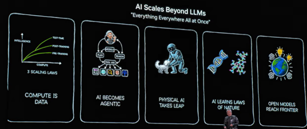 Jensen Huang used nearly half the presentation to detail five ways ‘AI is Scaling Beyond LLMs.’ While ‘compute is data’ (and will remain necessary), it was clear Mr. Huang is focusing on the uses of AI rather than just making a more performant product. Nvidia sees many emerging uses of AI – pictured below – such as Agents, Physical AI, broadening simulations of nature, and cultivating open-source models to spur creativity. It’s clear Nvidia is thinking about the use cases of its chips.