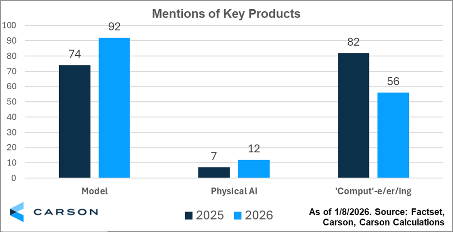What might have caught investors most off-guard is Nvidia’s shift in focus from hardware (such as GPUs and other chips) to models and software. Shown below, transcript analysis of Nvidia’s keynote address this year compared to last year depicts a jump in mentions of “Model” and “Physical AI,” and shows that there is a notable drop in the mentions of “’Comput’-e/er/ing.” To me, this signals that Nvidia is thinking about applications of AI beyond just core hardware performance increases.