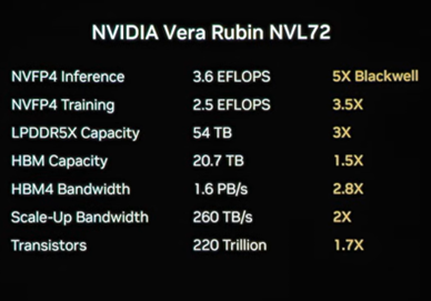 The Rubin family of GPUs is Nvidia’s latest generation of chips. Set to launch later this year, Rubin promises to continue the torrent pace of performance improvements Nvidia has become known for. Shown below, the company claims that Rubin will be capable of 5x the inference performance as its previous chip – Blackwell – and deliver up to 3.5x the training performance. Considering that Blackwell delivered roughly 3x performance to its predecessor – Hopper – this increase in performance gain is astounding.