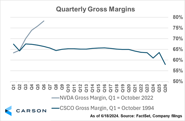 There’s an old quip that history doesn’t repeat but it often rhymes, and for all their similarities, Nvidia appears to be singing a sweeter tune than Cisco did during its rise. Comparing Cisco’s DotCom run to Nvidia’s AI growth is fair given the headlines, but investors should acknowledge that Nvidia’s fundamentals may actually be even better. Revenue growth is off to a quicker start, and expanding margins may tell us that there are fewer viable competitors thus far. We know Nvidia’s rise has been rapid, but we think investors should remain cautiously optimistic, recognizing both the immense potential and the inherent risks of investing in a rapidly evolving technology sector.