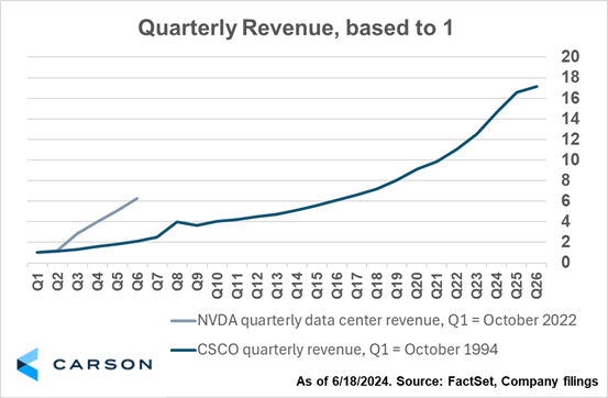 Cisco’s rise was spurred by an impressive 17x growth in the company’s quarterly sales. Revenue grew to $6,748 million in the January 2001 quarter from under $400 million in October 1994. Investors in Nvidia may take solace that revenue from the company’s Data Center segment has ‘only’ increased roughly 5x from the company’s October 2022 report, just before the AI buildout began.