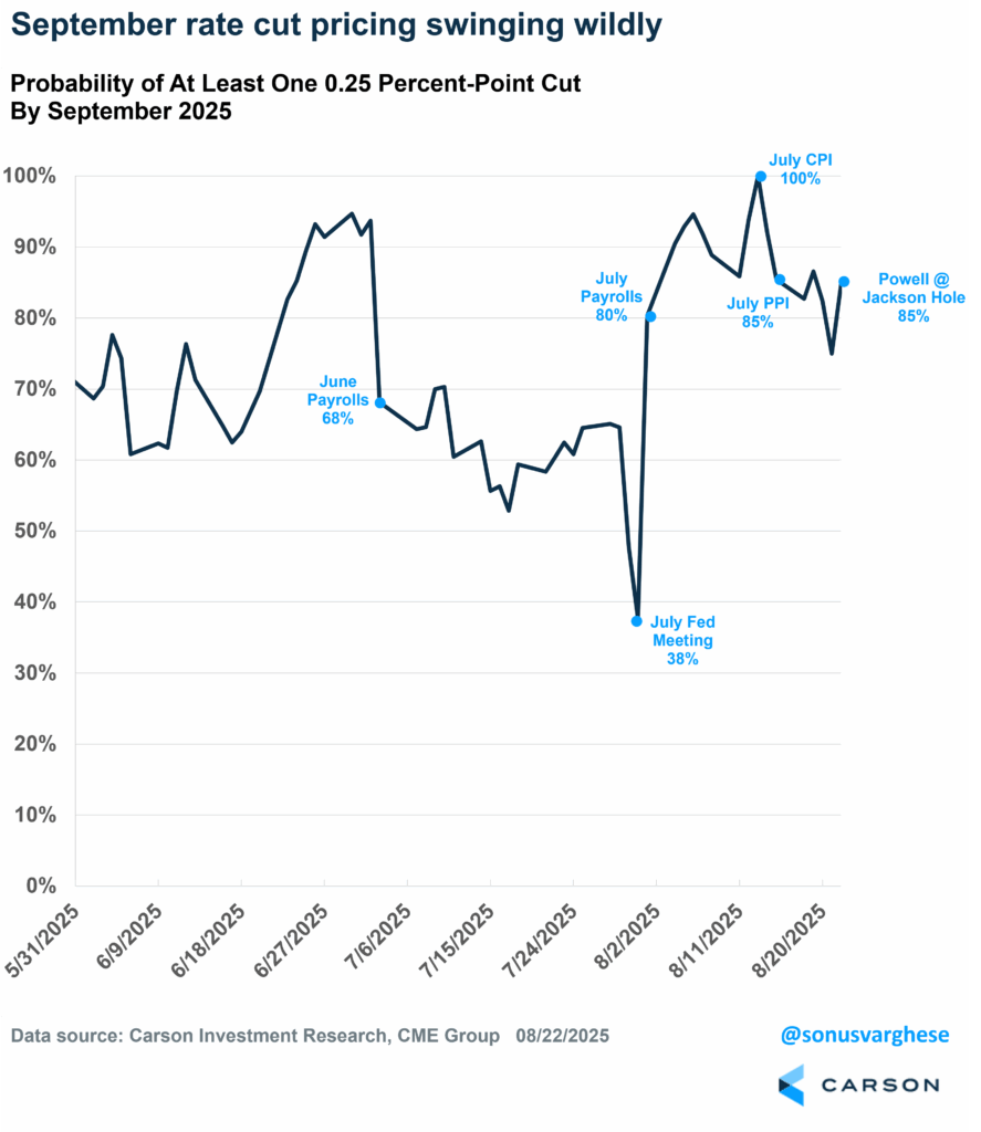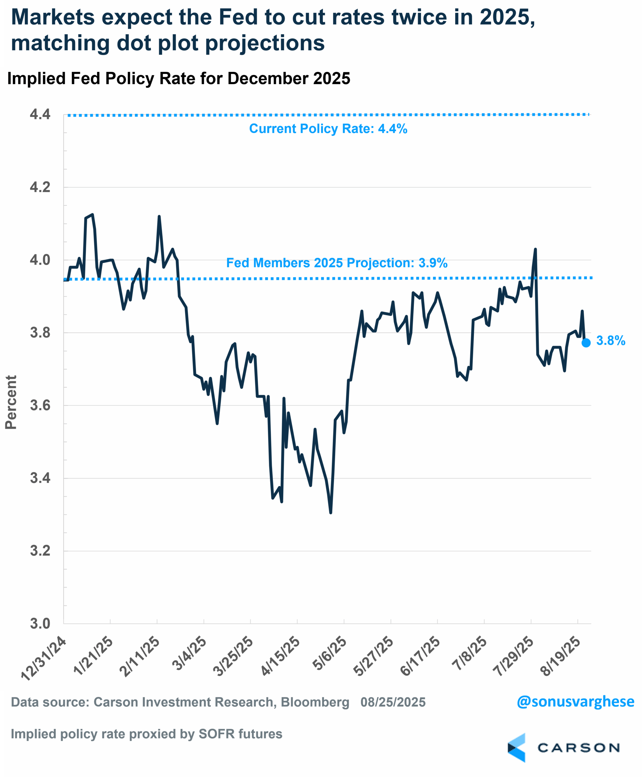 There’s divergence within the Fed as well. A couple of governors (Chris Waller and Michelle Bowman) are clearly on the dovish side, with Powell and San Francisco Fed Chair Mary Daly looking to be buying into their arguments. However, there are several on the other side who are more worried about recent inflation data, including Jeff Schmid (Kansas City Fed), Austan Goolsbee (Chicago Fed), Susan Collins (Boston Fed), and Beth Hammack (Cleveland Fed, but not a voting member of the committee this year). Back in June, the median Fed member projected 2 cuts in their outlook for 2025. However, 7 out of 19 members projected zero cuts. Granted, this was before the weak payroll numbers we got for July (and the downward revisions for May and June), but it was also before recent inflation data showing the numbers going the wrong way. All this to say, there’s a lot of divergence within the Fed given members’ different interpretations of the data, and this is likely why markets are still pricing in just about two cuts in 2025—in line with the median Fed member.
