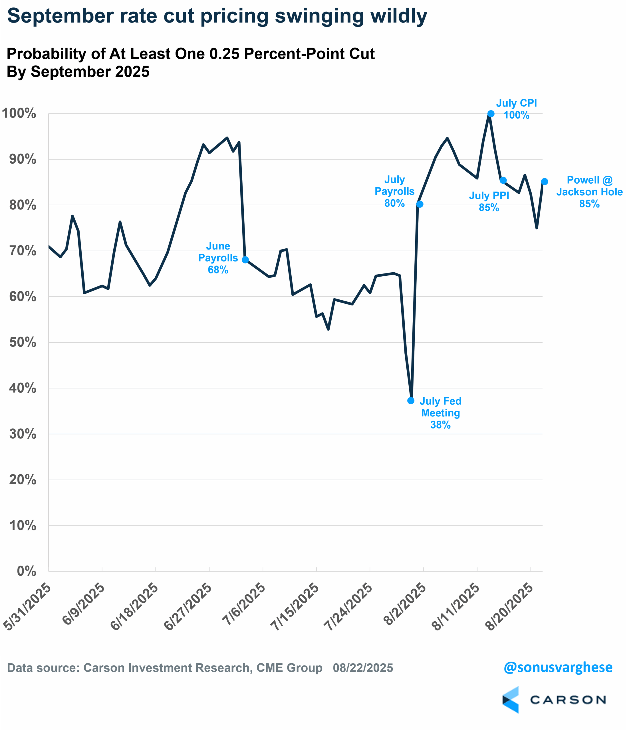 Market expectations reflected this, with the probability of a cut in September rising from 75% to 85% by the end of the day. In other words, there’s confidence that a cut is coming but it’s not a certainty. In fact, rate cut pricing is back to where it was after a hot Producer Price Index (PPI) report released the prior week, but not as high as the 100% probability after the better-than-expected Consumer Price Index (CPI) data.