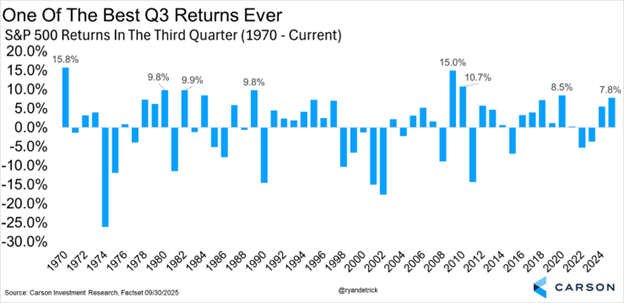 If the story of 2025 heading into the third quarter was one of “uncharted waters,” then Q3 held up its end of the bargain by flipping the script on history. Historically, the third quarter tends to be the weakest period for equities as investors contend with summer slowdowns and seasonal volatility, but this year was anything but typical. Investor sentiment remained resilient, and the market continued to grind higher despite a steady undercurrent of policy and geopolitical uncertainty.