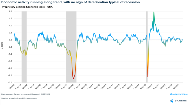 Carson’s proprietary Leading Economic Index (LEI) suggests that economic momentum remains near its long-term trend line, showing no decisive signs of either expansion or contraction. In other words, the economy continues to walk a narrow path between resilience and slowdown. Encouragingly, the LEI has rebounded modestly from post-Liberation Day readings that dipped below the trend line earlier this year, reflecting improving confidence in forward growth prospects.