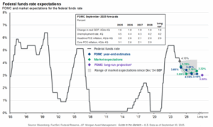 The Federal Open Market Committee (FOMC) continues to project a long-run policy rate of 3.00%, consistent with its estimate of a neutral rate — neither stimulative nor restrictive. However, markets remain more cautious, pricing in a path of slightly higher rates extending well into 2026. The first rate cut in September was a significant moment, signaling a transition from a tightening bias to a more balanced approach.