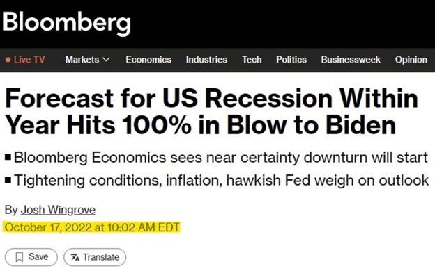 Three years ago today, at least one model was telling us there was a 100% chance of a recession (so much for models) and most economists were saying a recession was more likely than not. A Bankrate survey had 86% of economists saying a recession was more likely than not and a NABE survey had over half the panelists saying so. Everywhere we’d look investors and economists alike were proclaiming how much worse things would get. Stocks were down 25%, the yield curve was inverted, manufacturing was in shambles, inflation was soaring, the Federal Reserve was hiking at a pace rarely seen in history, and even bonds (usually a safety place when stocks do poorly) were getting crushed.