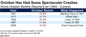 Well, that October volatility and spookiness is happening, but to be honest, we aren’t surprised. Yes, worries over trade with China, regional banks, and private credit are taking “credit” for the recent weakness. (See how I did that?) But the truth is after a historic six-month rally and with the usually volatile month of October upon us, we are welcoming this volatility and potential weakness as an opportunity before a likely strong end of year rally.