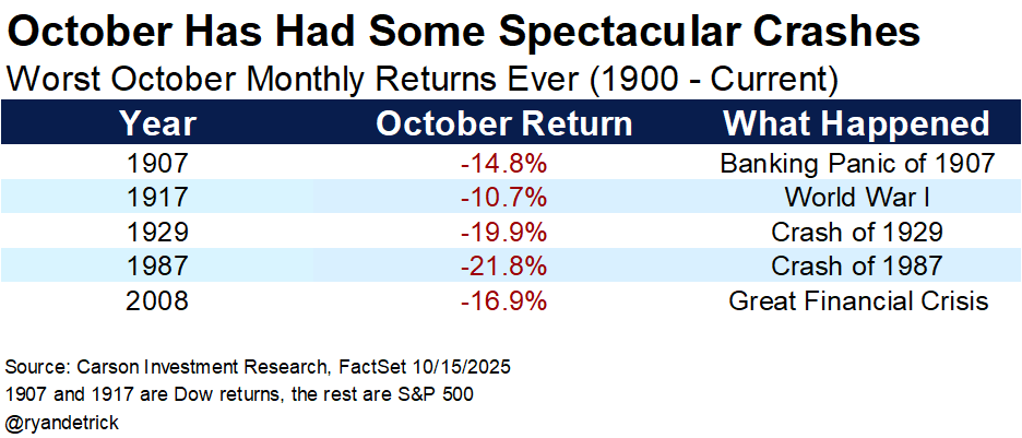 October is known for many things, with incredible market crashes likely at the top of the list. The crashes of 1929 and 1987 stand out for many investors and who could forget the selling and volatility of October 2008? Going back further we also saw spectacular crashes in 1907 and 1917.