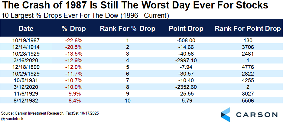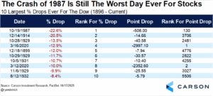 In honor of the greatest drop in stock market history, we’ll take a closer look at the crash of 1987. On Monday, October 19, 1987, the Dow fell 22.6% for the largest one-day drop in the more than 129-year history of the Dow. To this day it is still the largest percentage drop ever, but it now ranks as only the 130th largest point decline.