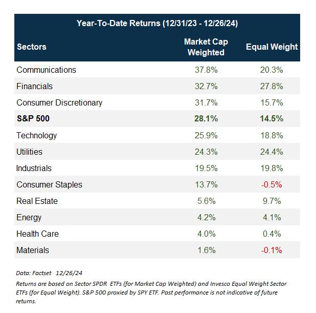 Another argument here is that it’s all about the Magnificent Seven stocks. But this would be bit of lazy analysis on my part. What’s interesting is that in 8 of 11 sectors, the market cap-weighted sector index outperformed the equal-weighted sector portfolio — industrials and utilities were the exception (the returns were close), along with real estate. So, this wasn’t just about Technology, or Tech-adjacent stocks. In almost every sector, returns favored the largest companies. This is something we’re thinking deeply about and will discuss in the future.