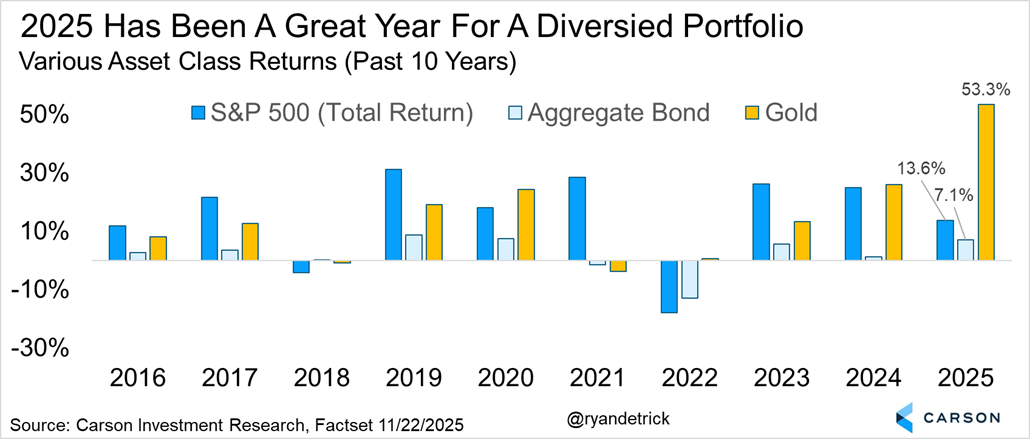 What about bonds? They are looking at their best year since 2020 and gold is having its best year since 1979. All in all, this has been a very nice year for portfolios and for once you don’t have to say ‘sorry’ for being diversified.