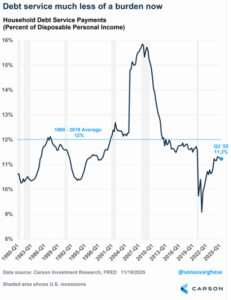 Yes, overall we have more debt than we had a year ago, 10 years ago, 50 years ago, etc. That’s the headline we hear all the time, but what about the denominator? The overall and average wealth and income levels are much higher and this usually gets lost in the shuffle. Household debt service payments as a percentage of personal income it is 5.3%, the same as last year and well beneath the more than 15% before the Great Financial Crisis or even before Covid.