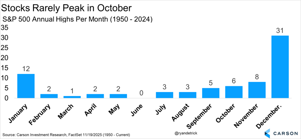 We remain optimistic this bull market is far from over and we could see a strong year-end rally, with likely new highs before 2025 is said and done. That is quite normal, as only six times did the S&P 500 peak for the year in October and we don’t think this will be seven. Did you get my weak attempt at a six seven joke?