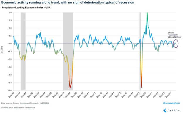Here’s our Carson Investment Research Proprietary Leading Economic Index (LEI) for the US and it shows indeed our economy is improving under the surface. Take note, this LEI never predicted a recession in 2022 and 2023 like so many other indicators did.